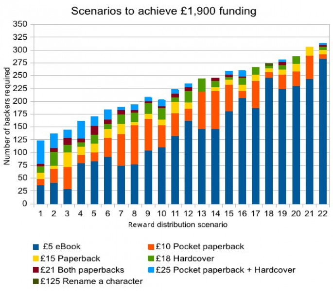 I then created another sheet to show how much money would be raised with different distributions of a number of backers at the various reward levels. The scenarios vary from most people wanting the cheapest reward (the eBook) to more people wanting physical books.