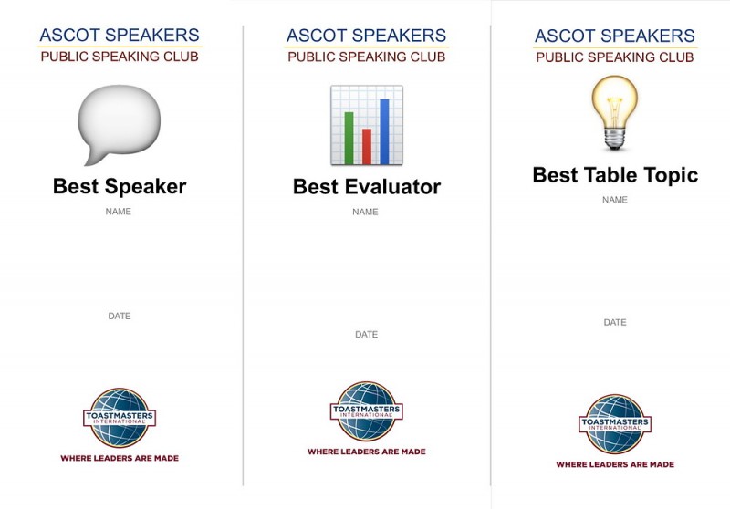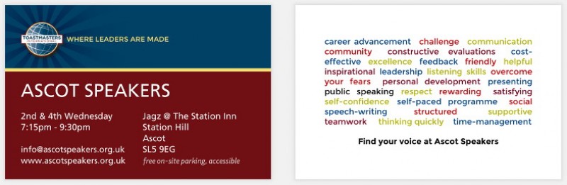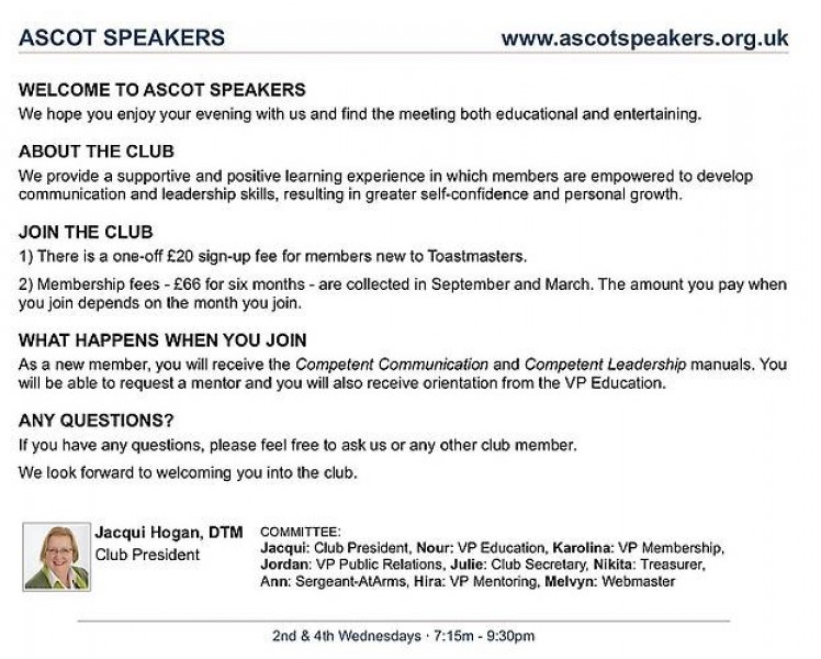 I researched, organised, designed materials, wrote guides, and took the role most of the committee the first year. I wasn't happy at my previous club, feeling that they could do more for members. I put all my ideas into Ascot Speakers. This project is a good example of my organising and creative skills.
